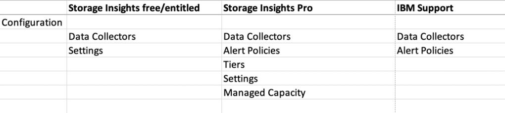 In the above image you will see the different menu presentations depending on the level of IBM Storage Insights you are currently using (at the time of this writing). The top image shows IBM Storage Insights (free/entitled), the second image you will see IBM Storage Insights Pro (subscription or IBM Storage Insights for IBM Spectrum Control), and the third image is the IBM Support view of IBM Storage Insights (when support is engaged to look at collected customer data).